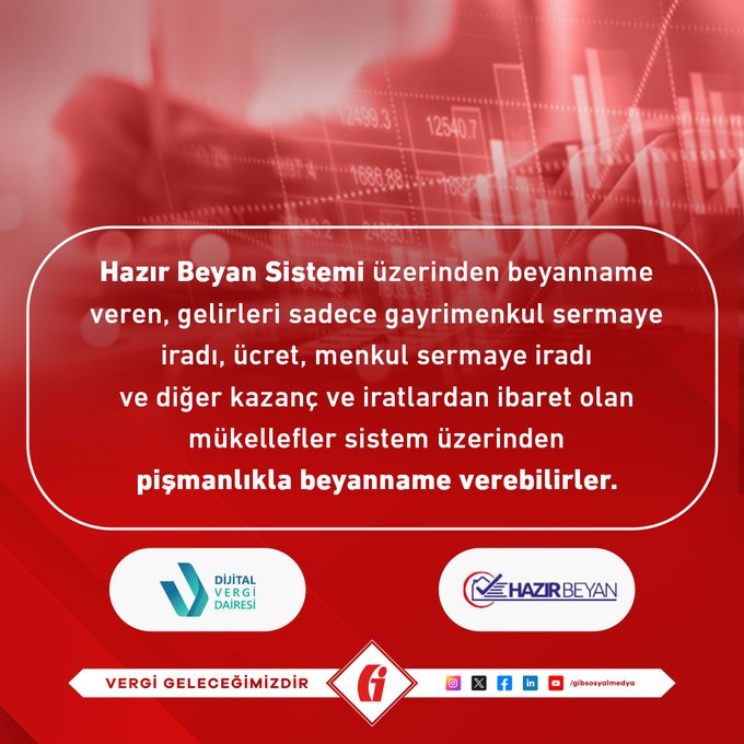 #Hatırlatma Kanuni süresi içerisinde verilmeyen beyannamelerinizi Dijital Vergi Dairesi Hazır Beyan Sistemi üzerinden pişmanlık talepli veya kanuni süresinden sonra seçenekleri ile verebilirsiniz.