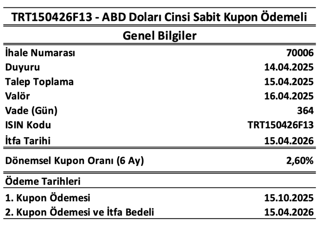 Buna göre, 213 milyon 125 bin dolar tutarında 16 Nisan valörlü, 15 Nisan itfa tarihli kira sertifikası ve 1 milyar 473 milyon 749 bin dolar tutarında 16 Nisan valörlü, 15 Nisan itfa tarihli devlet tahvili ihraç edildi.