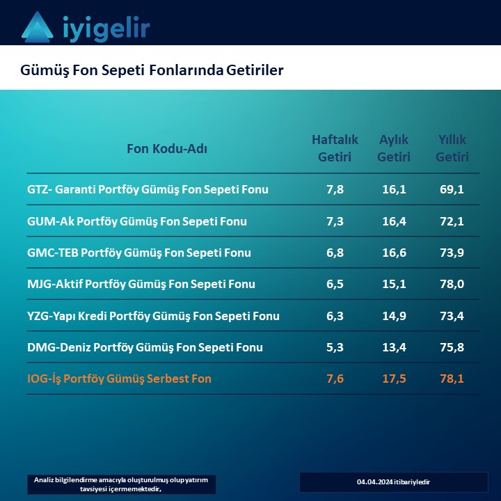 1. Gümüş fonlarında liderlik değişti. En iyi İş IOG ve Teb GMC oldu, En kötü Deniz DMG oldu. IOG serbest olduğu için stopaj var, diğerlerinde 31 Nisana kadar alınırsa sıfır stopaj imkanı devam ediyor.