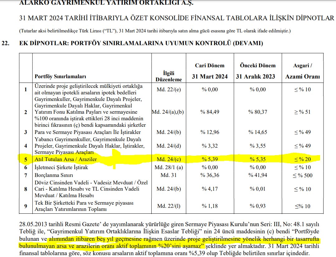 bulunulmayan arsa ve arazilerin oranı aktif toplamının %20’sini aşamaz” şeklinde yer almaktadır. 31 Mart 2024 tarihli