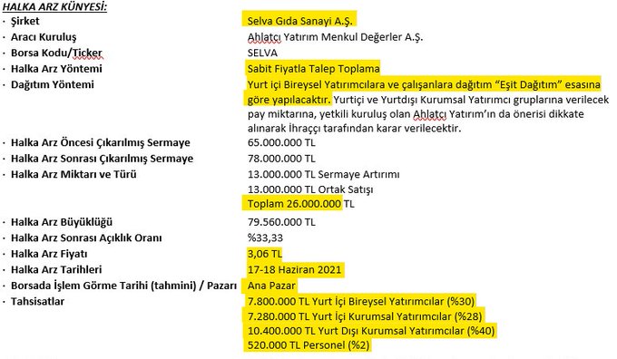 Şirketimizin paylarının Halka Arzına ilişkin olarak; 14.06.2021 (Bugün) tarihli Dünya Gazetesi 11.sayfasında "Selva Gıda'nın Halka Arzına onay çıktı" başlığıyla yayınlanan haberin içeriğinde yer verilen bilgiler bütünüyle hatalı olup; yatırımcıların yatırım kararlarını hatalı şekilde yönlendirebilecek nitelik arz etmektedir. İlgili basın kuruluşu haber içeriğinin sehven hatalı yayınlandığını ifade etmekte olup; habere ilişkin tekzip metni ilgili basın kuruluşuna gönderilmiştir.
