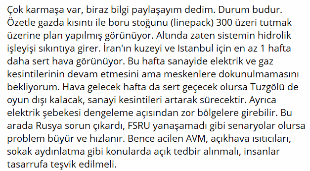 Dün görüşlerini paylaştığım enerji uzmanının son durum değerlendirmesi. Elektrik üretimi çok düşmüş, Tuz Gölünde sadece 6 günlük stok kalmış.