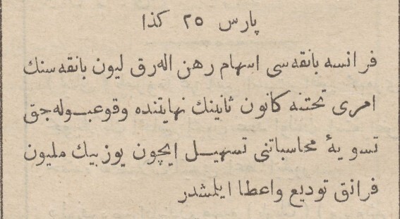 fransa bankası esham (hisse senedi) rehin alarak liyon bankasının emri tahtına - kanunusaninin nihayetinde vuku bulacak tesviye-i muhasebatını teshil (kolaylaştırmak) için yüz bin milyon frank tevdi ve iata eylemiştir.