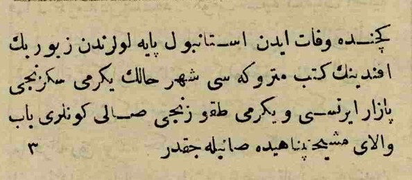 geçende vefat eden istanbul paye-i livalarından ziver beyefendinin keteb-i metrukesi (malları) şehr-i halin (ayın) yirmi sekizinci pazartesi ve yirmi dokuzuncu sali günleri bab-ı velayi meşihatpenahide satılacaktır.