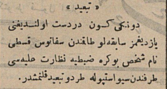 dünkü gün derdest olduğunu yazdığımız sabıkalı takımından sefanos kosti nam şahıs bu kerre zabtiye nezareti aliyesi tarafından sivastopola tard ve teb'id kılınmıştır.