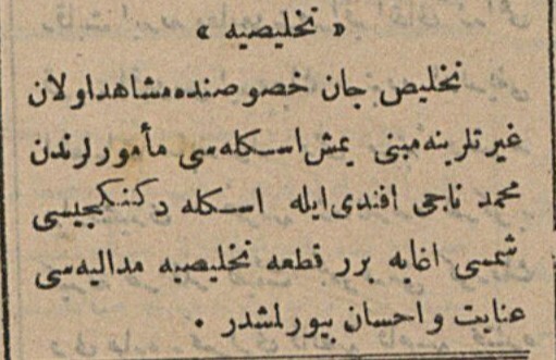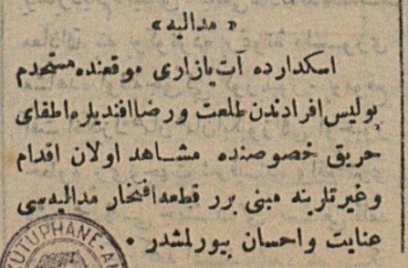 üsküdarda at pazarı mevkiinde müstahdem polis efradından talat ve rıza efendilere itfa-i harik (yangın söndürme) hususunda müşahade olan ikdam ve gayretlerine mebni birer kıta iftihar madalyası inayet ve ihsan buyurulmuştur.