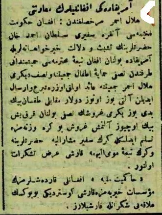 hilal-i ahmer murahhaslığındam : - afgan hükümeti fehimesi ankra sefiri sultan ahmed han hazretlerinin teşebbüs ve delaleti hayru havahaneleriyle amerikada bulunan afgan teba-i muhteremesi hamiyet-medanı tarafından - nısfı (yarısı) himye-i etfal cemiyetine (çocuk esirgeme kurumuna),