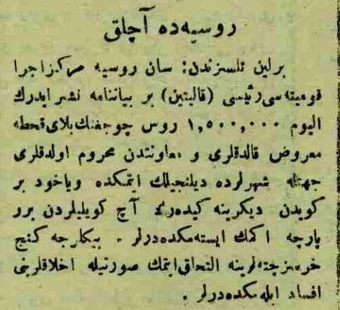 "Berlin telsizinden: Sant (Sen) Rusya Merkez İcra Komitesi Reisi (Kalinin) bir beyanname neşrederek elyevm 1.500.000 Rus çocuğunun belay-ı kahta (kıtlığa) maruz kaldıkları ve muavenetten mahrum oldukları cihetle şehirlerde dilencilik etmekte veyahut bir köyden diğerine giderek aç köylülerden bir parça ekmek istemektedirler. Binlerce genç hırsız çetelerine iltihak etmek suretiyle ahlaklarını ifsad eylemektedirler