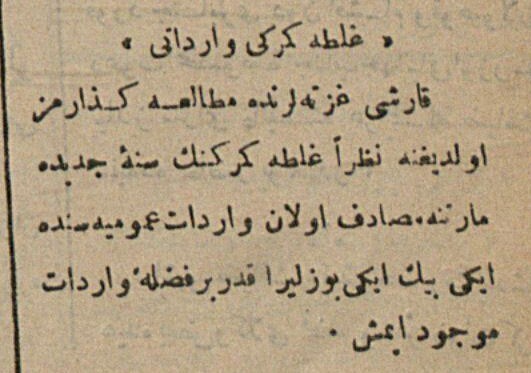 "Karşı gazetelerde mütala-i güzarımız olduğuna nazaran Galata Gümrüğü'nün sene-i cedide (yeni yılın) Martna müsadif olan varidatı umumiyesinde iki bin iki yüz lira kadar bir fazla-i varidat (gelir) mevcud imiş.