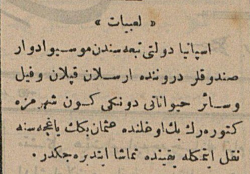 "İspanya devleti tebaasından (vatandaşından) Mösyö Eduar, sandıklar derununda (içinde) arslan, kaplan ve fil ve sair (diğer) hayvanatı dünkü gün şehrimize getirerek Beyoğlu'nda Osman Bey'in bahçesine nakil etmekle yakında temaşa ettireceklerdir (seyrettirecektir)