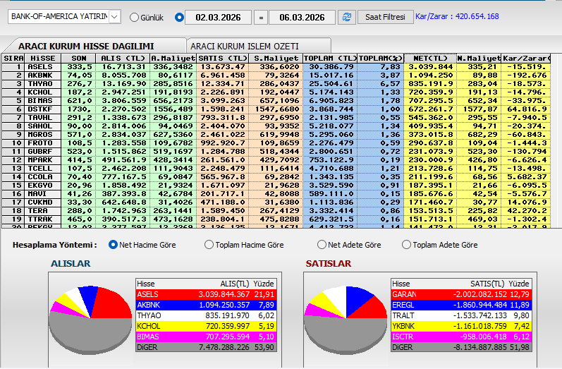 BofA nın haftalık istatistikleri, bu hafta ASELS AKBNK alıp GARAN EREGL satmış, haftalıkta 420 mlyn tl kar yazmış!