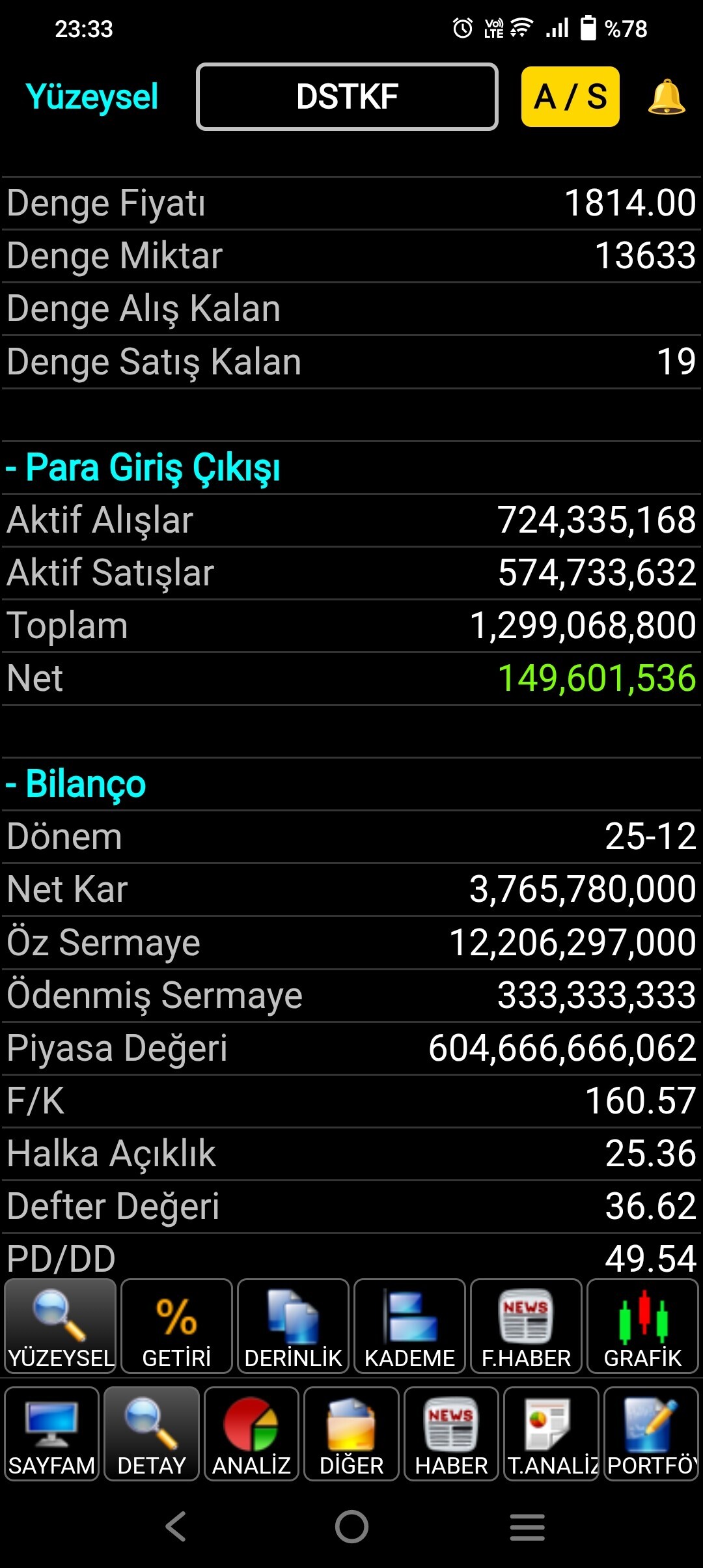Hocam bilanço işi hikaye, bir sürü uzaya çıkmış hisse var hiçbirinin bilançosu bulunduğu fiyatı desteklemiyor, birileri birilerinden icazet almışsa her şey oluyor, bir tanesi örnek olsun diye atıyorum, hepsini buraya yapıştırmaya kalksak sayfalar yetmez, birde bunu BIST 30 a soktular ve BIST endeksine etkisi çok fazla, F/K ve PD/Dd her şeyi anlatıyor...