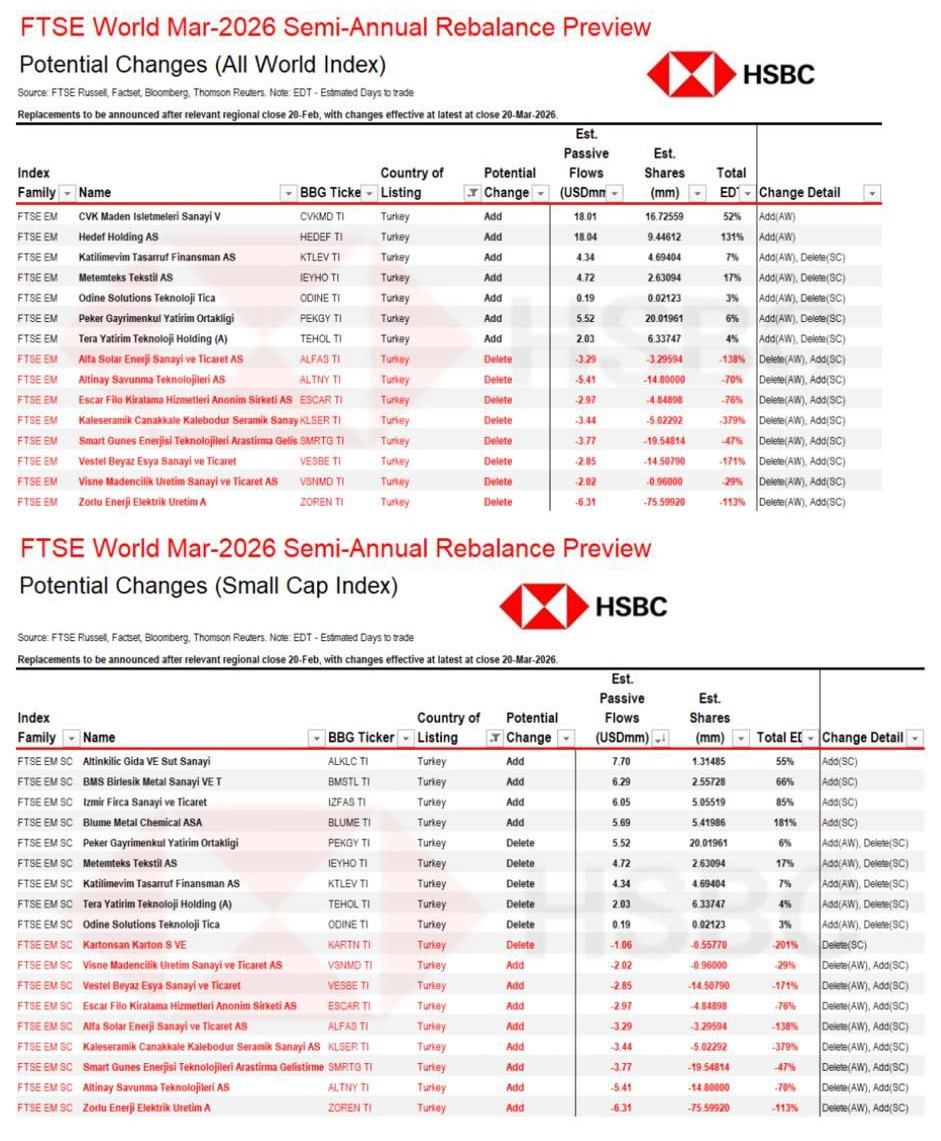 HSBC Endeks Strateji ekibi, FTSE Russell tarafından 20 Şubat Cuma günü duyurulacak olan Mart 2026 yarıyıl endeks dengeleme sonuçlarına ilişkin tahminlerini paylaştı. Türkiye piyasalarındaki endeks değişiklikleri, bayram tatilleri nedeniyle 18 Mart kapanışında yürürlüğe girecek.