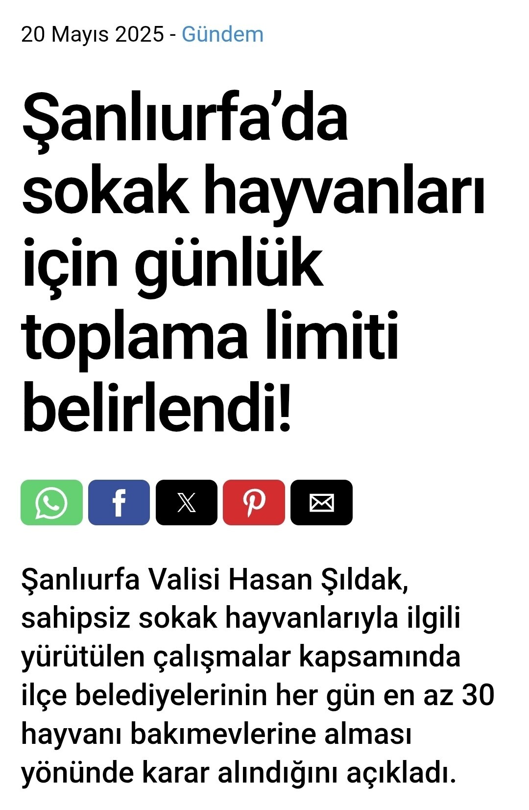 Şanlıurfa Valisi Hasan Şıldak, kentteki bütün sokak hayvanlarının toplatıldığını açıkladı. Yürütülen faaliyetler kapsamında il genelinde 27 bin 960 sahipsiz hayvan toplanarak bakımevlerine götürüldü.